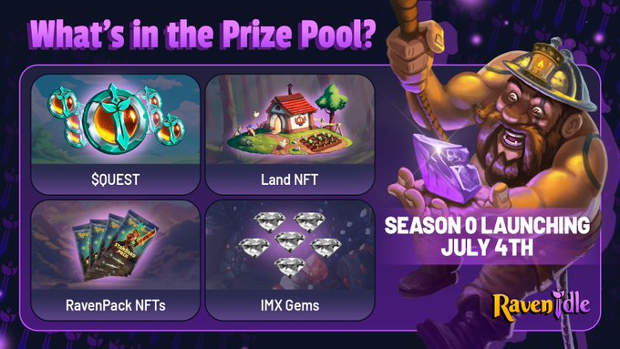 This is an idol game by the guys that made Raven Quest, with a prize pool starting at $70,000, and it could grow all the way to $570,000 worth of Quest tokens of NFDs and IMX gems, immutable gems. Season Zero launches on July 4th. This is going to be an idol game. So, it's called RavenIdle. It's going to be one of those games you can play, like Luther on your main screen, and then you can just have Raven Idle on your phone a little bit and put it on the side and let it do its thing.